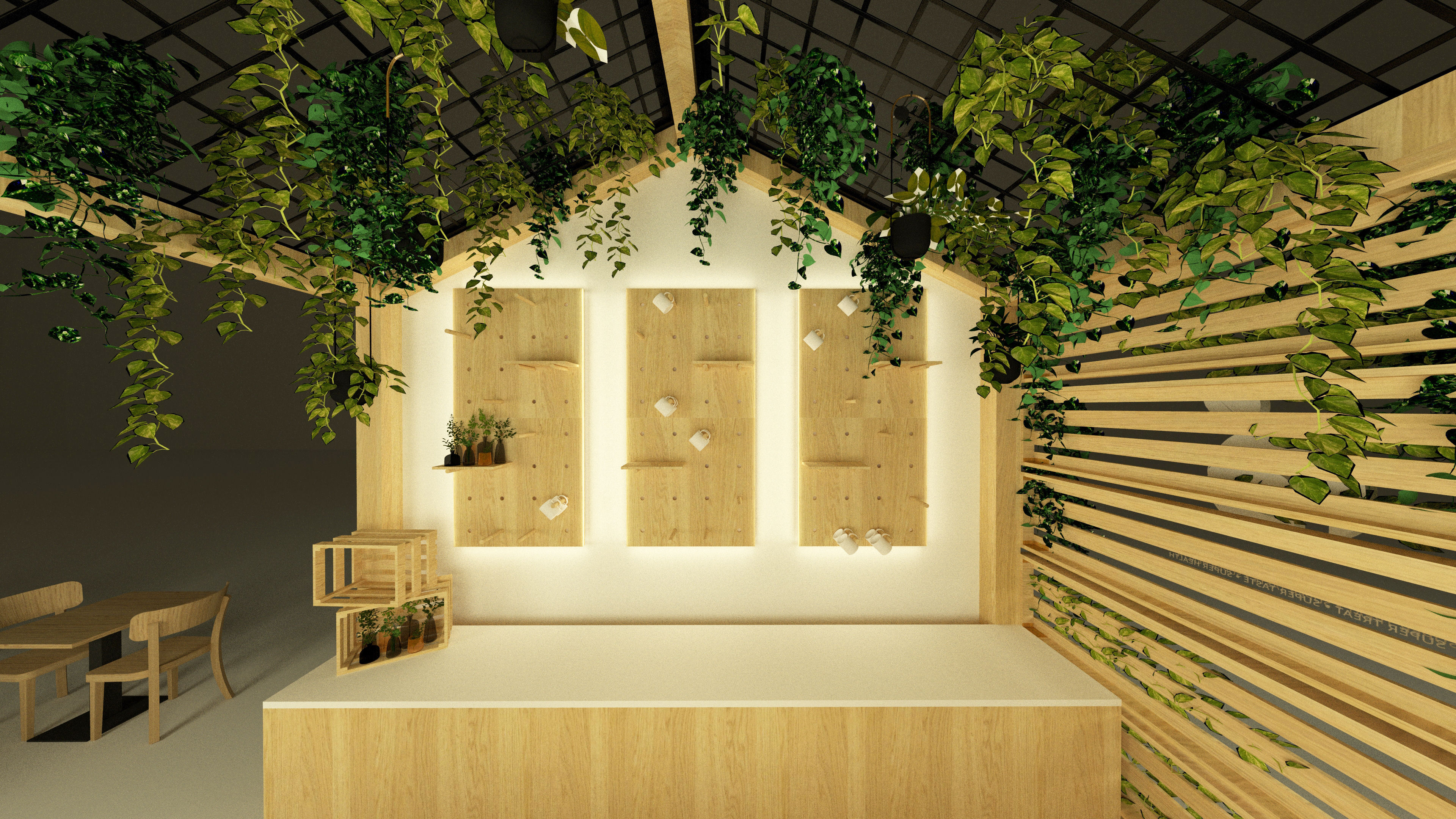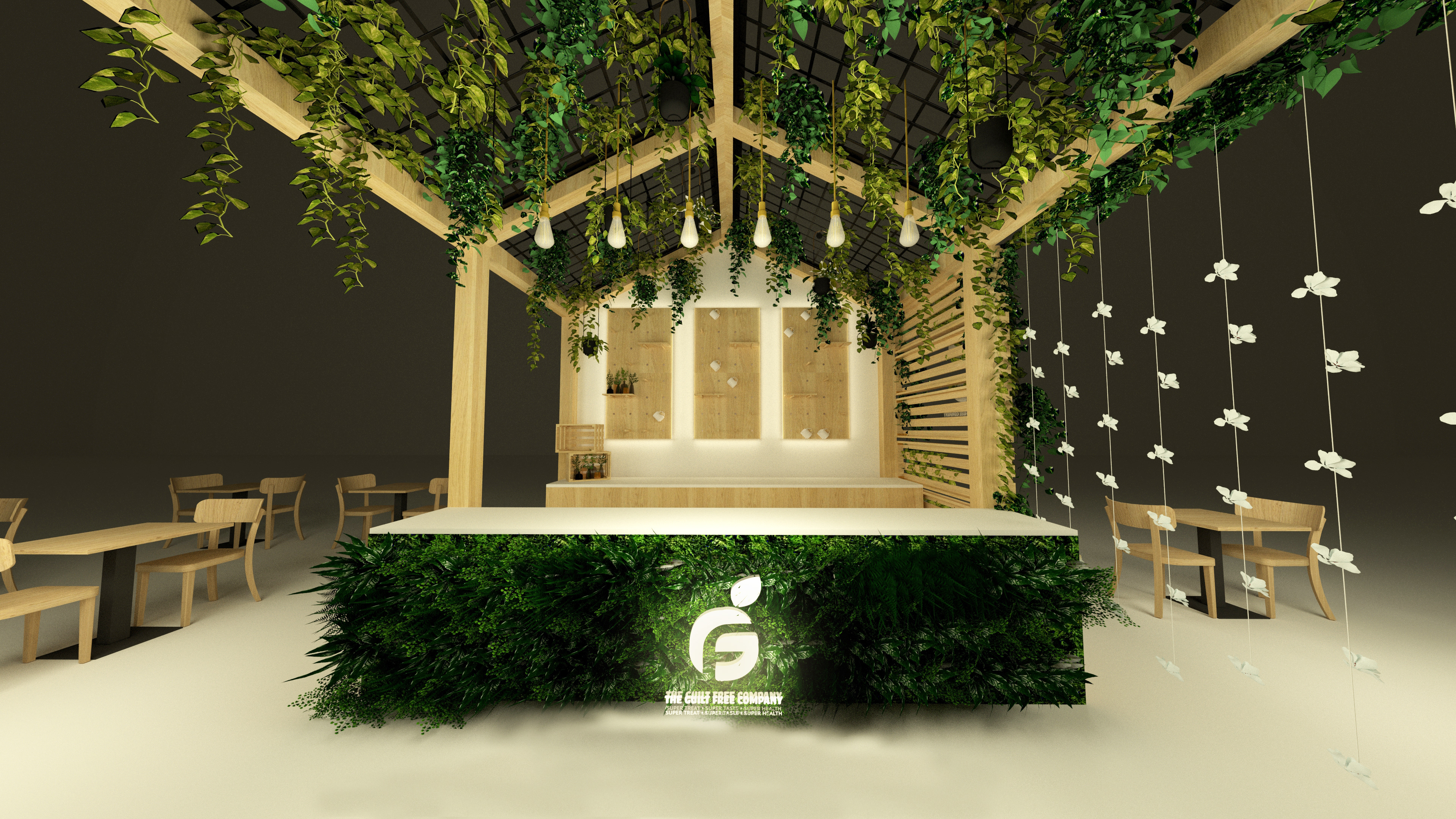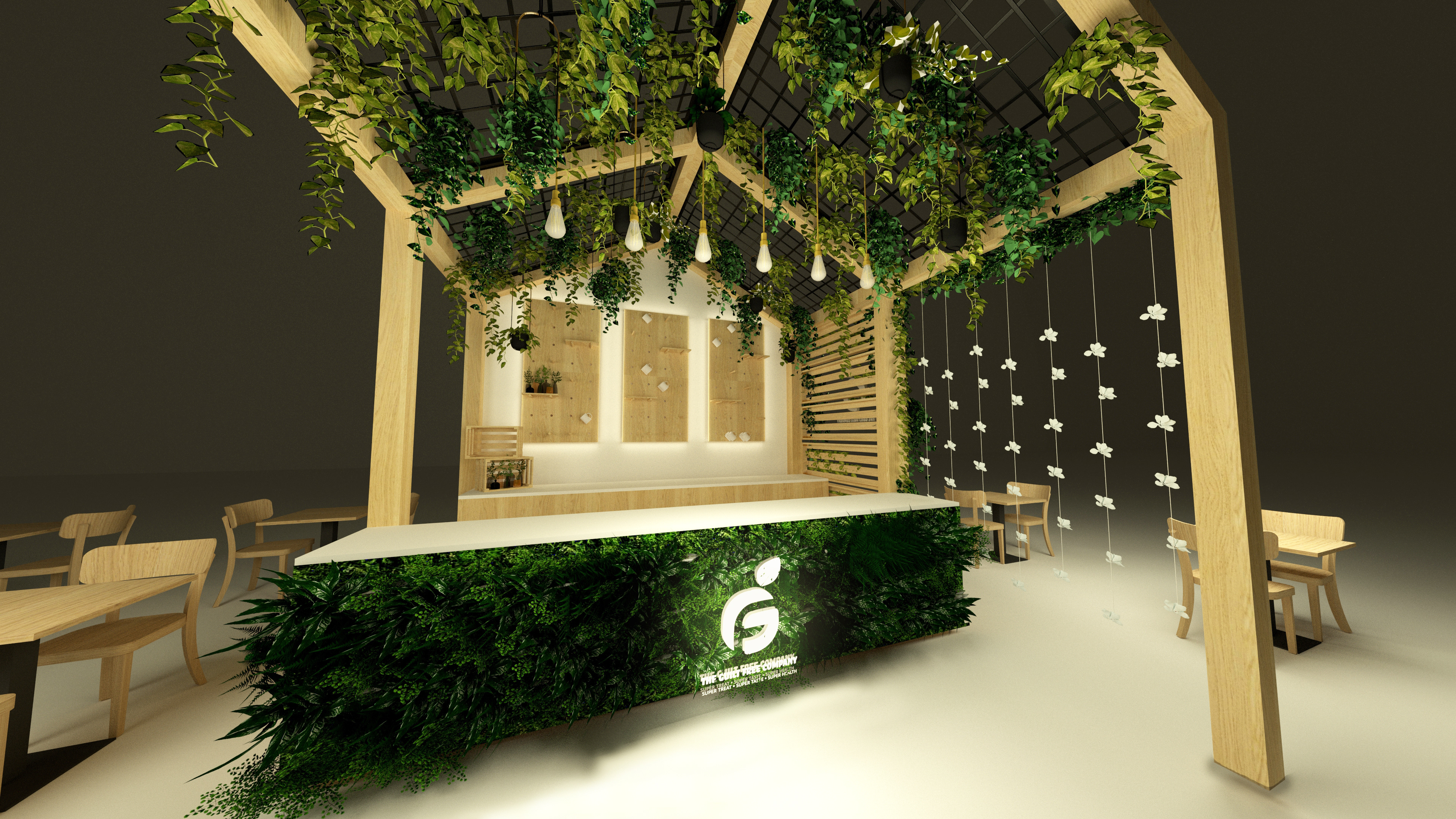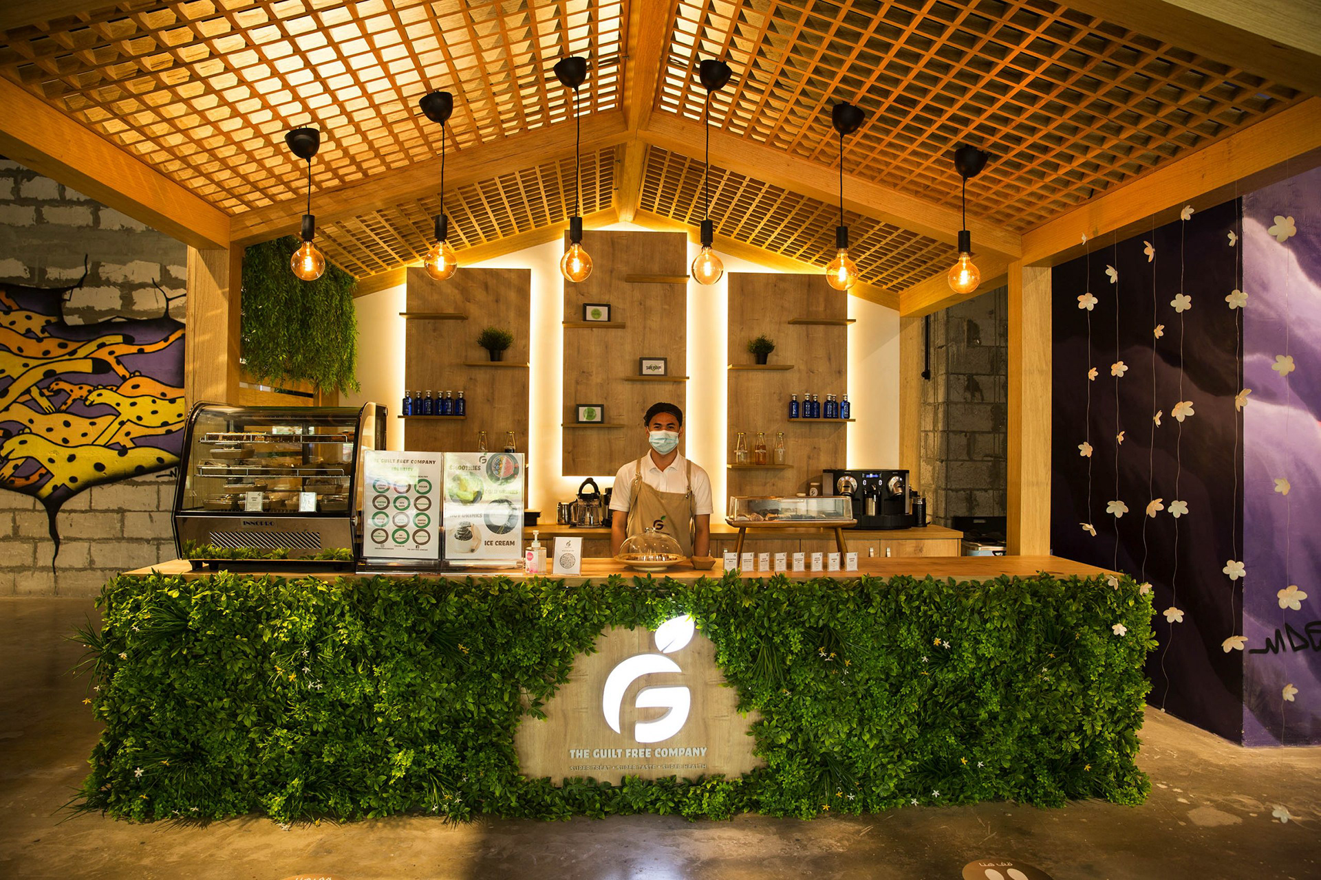 Located in Galleria Corner, where foodies explore multiple kiosks, the GFC kiosk embodies the spirit of healthy living through design. Natural wood, lush greens, and warm light reflect the purity and balance of wholesome food. Every element is intentional, from the lattice ceiling to the hanging bulbs to the balanced shelving. Simple, honest, and alive. A space that mirrors the calm energy of eating well.